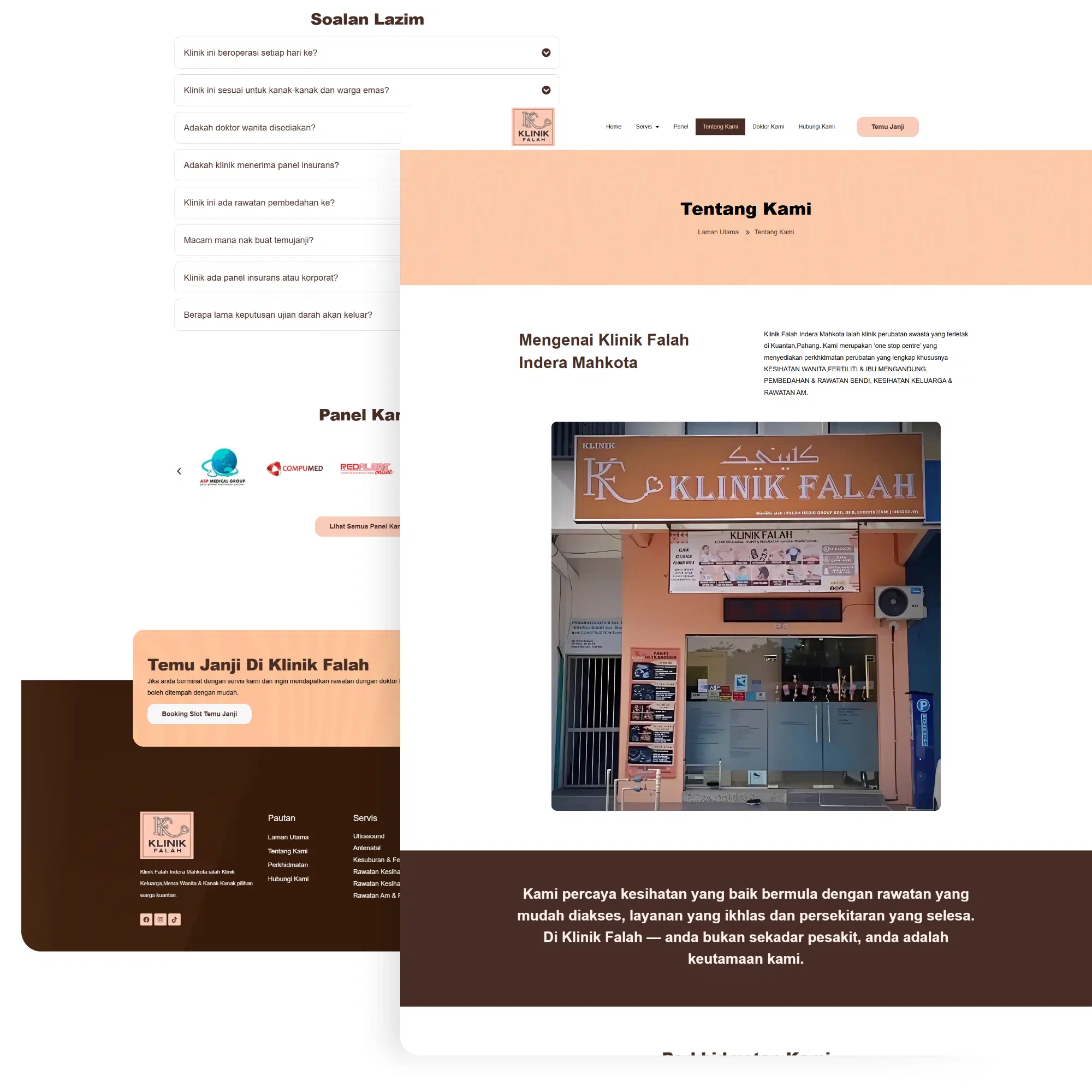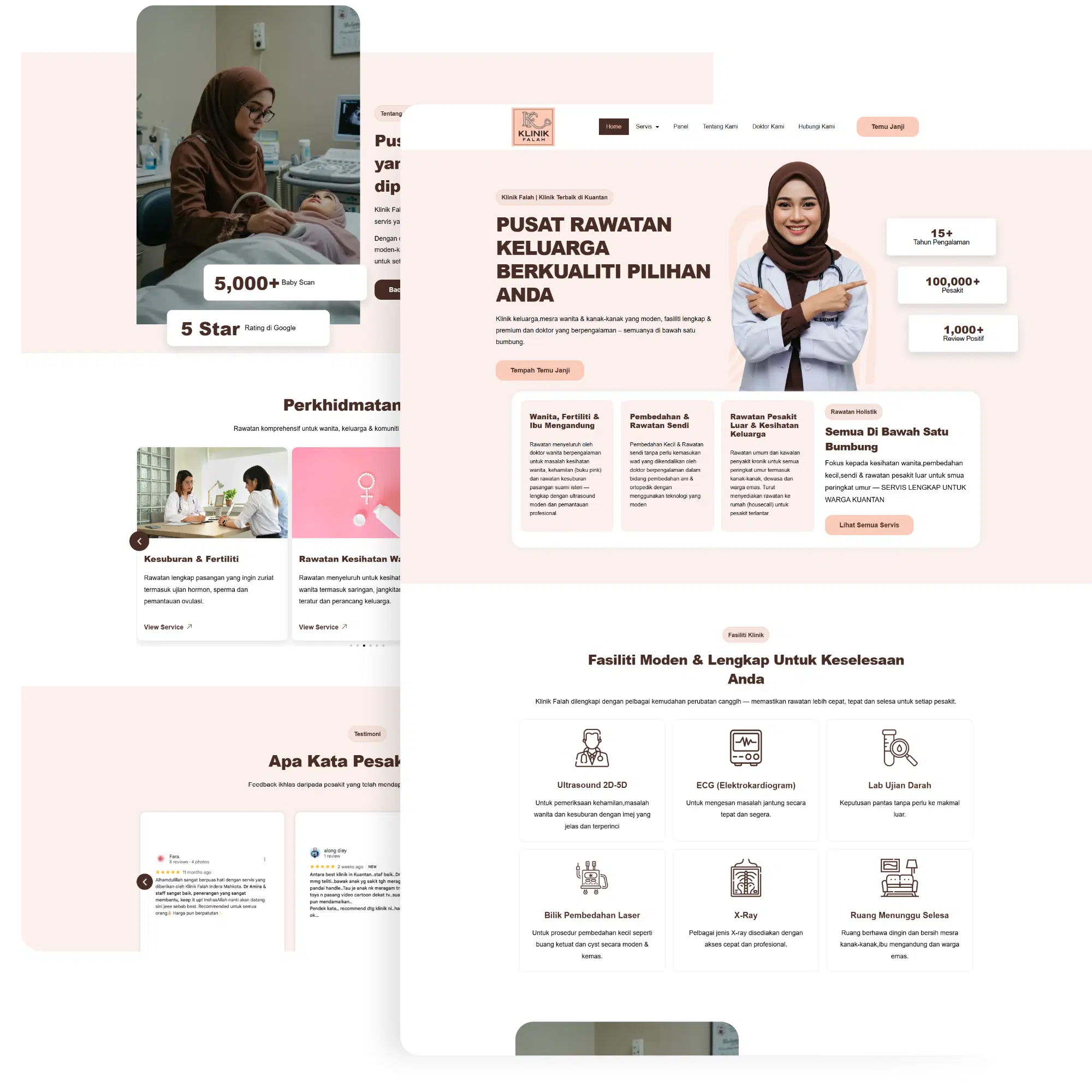 Kami membangunkan laman web berjenama sepenuhnya, dioptimumkan SEO dalam Bahasa Malaysia yang mencerminkan reka bentuk fizikal klinik dan tumpuan komuniti. Tapak ini menampilkan halaman perkhidmatan yang jelas—kesihatan wanita, pediatrik, keluarga, penjagaan sendi dan pembedahan kecil—imej menarik, profil doktor, navigasi mesra pesakit dan pilihan hubungan yang lancar (WhatsApp, panggilan, borang tempahan). SEO pada halaman menyasarkan kata kunci tempatan seperti “klinik wanita Kuantan,” “klinik gigi Kuantan,” dan “rawatan sendi Kuantan.”