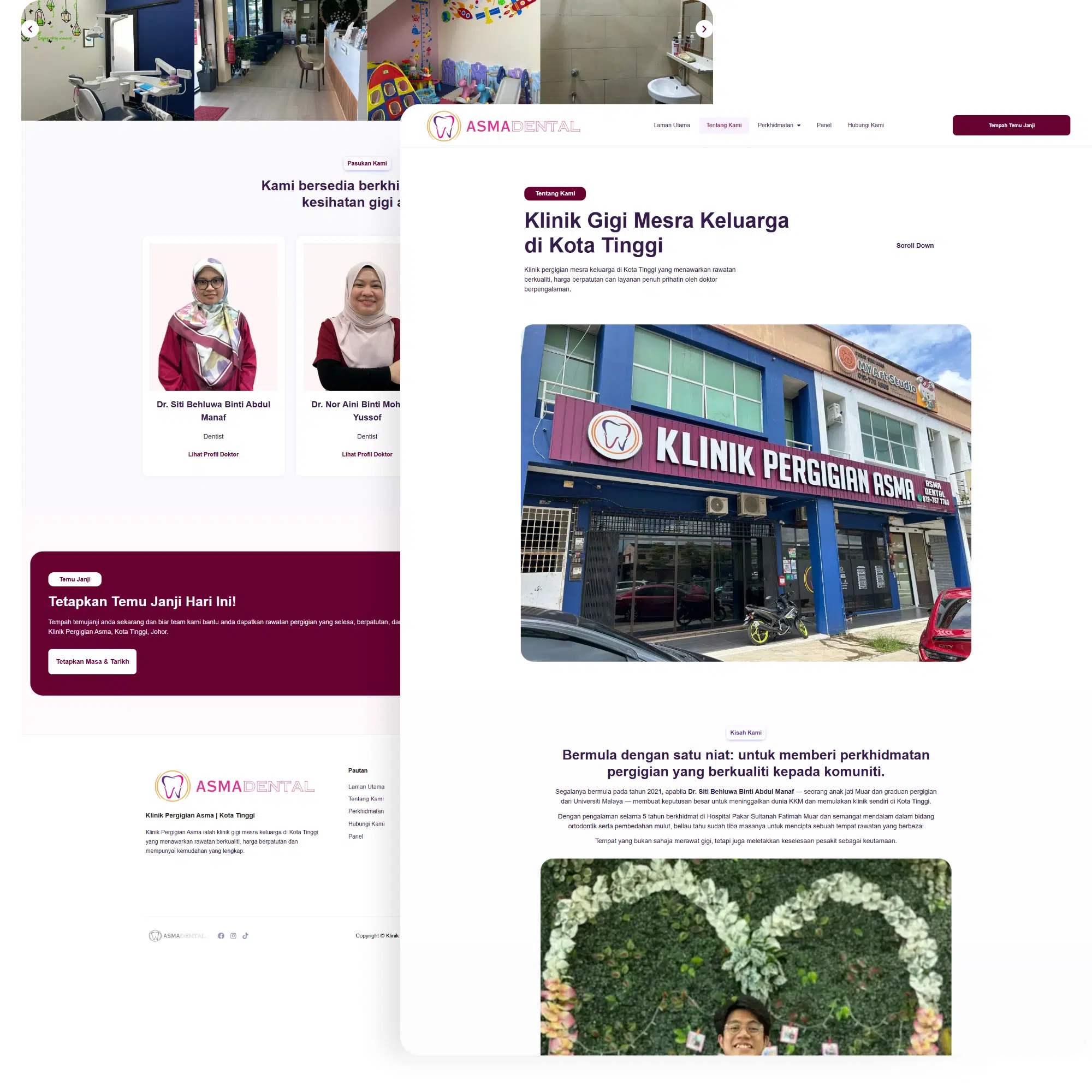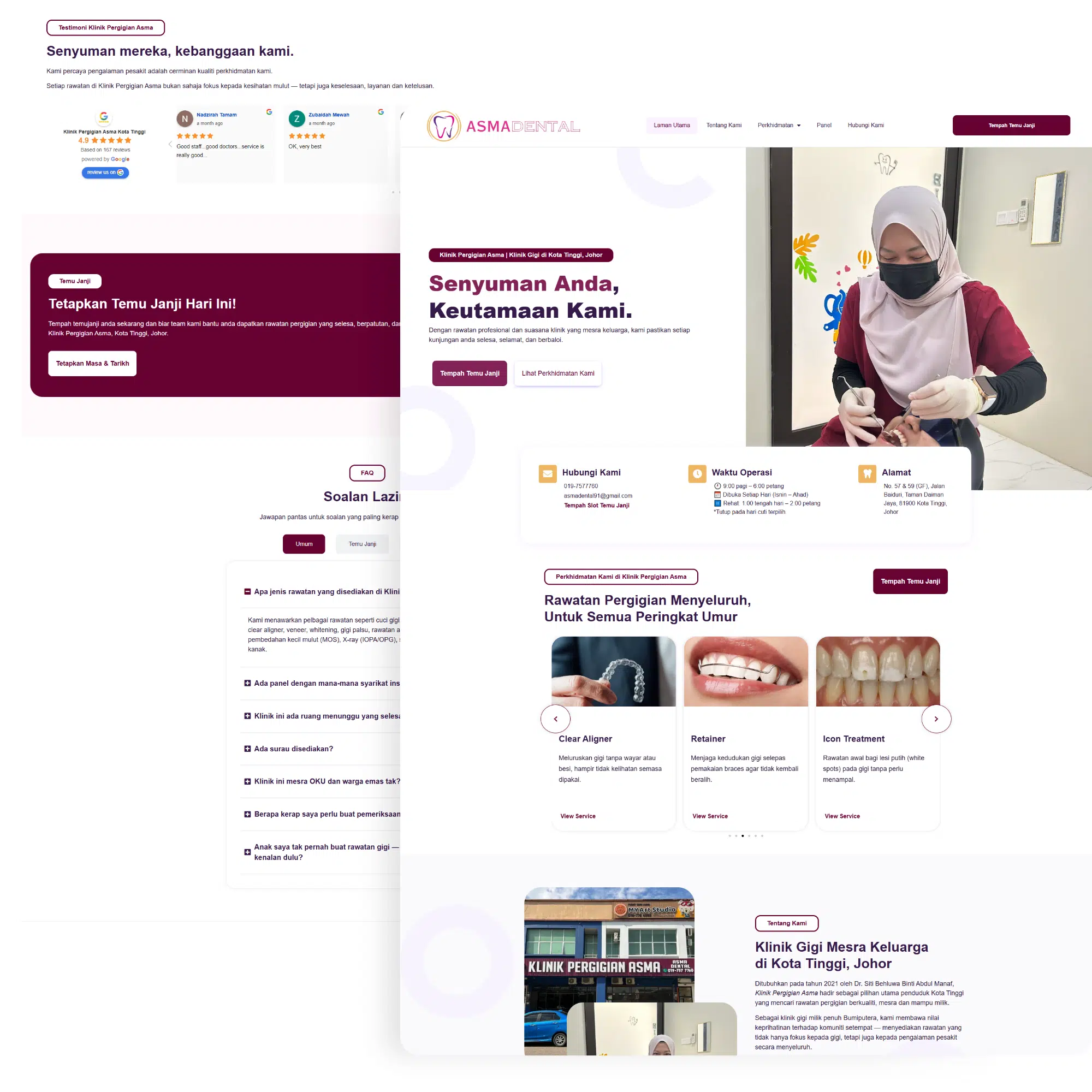 Kami membangunkan laman web berasaskan Bahasa Malaysia berjenama sepenuhnya yang mencerminkan warna klinik fizikal, reka bentuk dan estetika imej Klinik Pergigian Asma—mendapat inspirasi daripada papan tanda dan kandungan sosial mereka. Seni bina tapak dan metadata telah dioptimumkan untuk kata kunci bahasa Melayu tempatan seperti “klinik gigi Kota Tinggi,” “penskalaan Kota Tinggi” dan “pendakap gigi Kota Tinggi.”