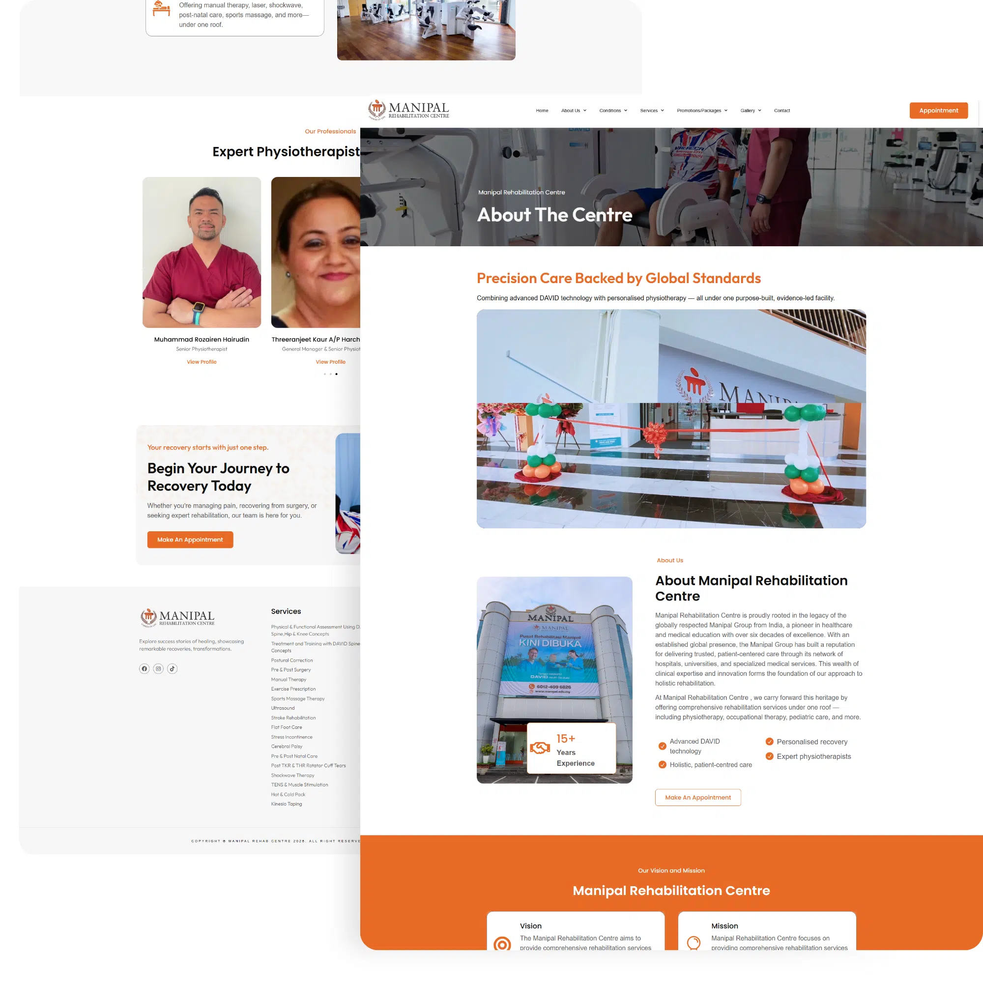 Untuk menjadikan laman web ini praktikal dan mesra pesakit, kami menyepadukan sistem janji temu sedia mudah alih yang membolehkan pengguna menempah perundingan dengan mudah. Pada masa yang sama, kami mengoptimumkan laman web dengan strategi SEO tempatan, memastikan pusat itu muncul dalam carian yang berkaitan dengan fisioterapi dan pemulihan di Melaka. Ini bukan sahaja membina kesedaran tetapi juga meletakkan Pusat Rehab Manipal sebagai nama yang dipercayai dan boleh ditemui dalam komuniti.
