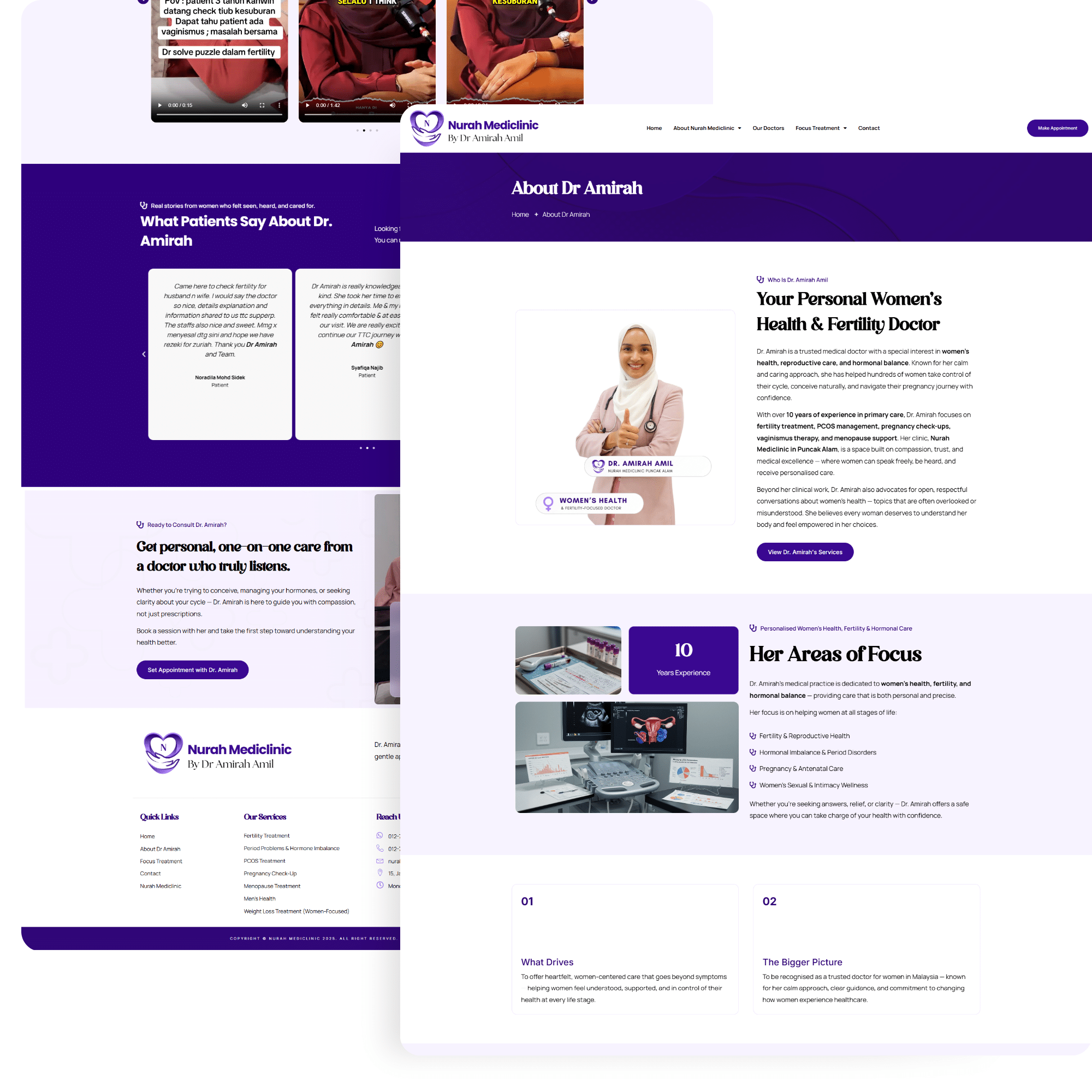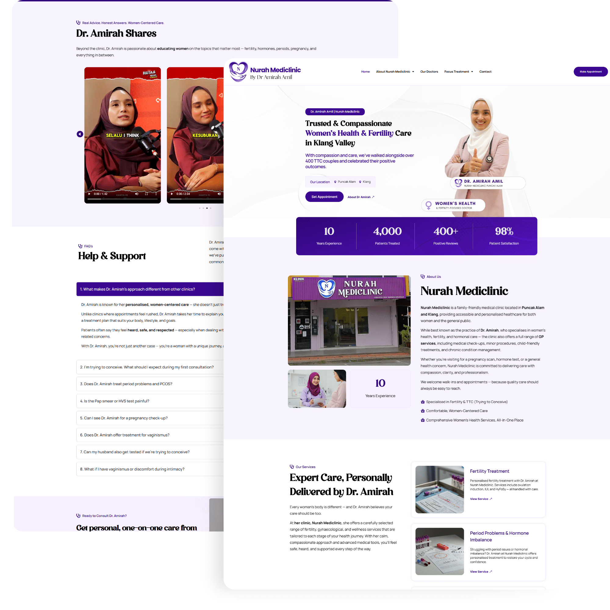 Nurah Mediclinic is a general practice clinic with branches in Puncak Alam and Klang, led by resident doctor and clinic owner, Dr. Amirah Amil. With a special interest in fertility and women’s health, Dr. Amirah has built a solid reputation online, drawing patients who are specifically looking for her expertise. The clinic approached us to create their first website, with the clear direction of positioning Dr. Amirah at the forefront, while still highlighting the broader scope of services available as a GP clinic. The website was designed to balance both personal branding for Dr. Amirah and the professional branding of Nurah Mediclinic as a trusted healthcare provider.